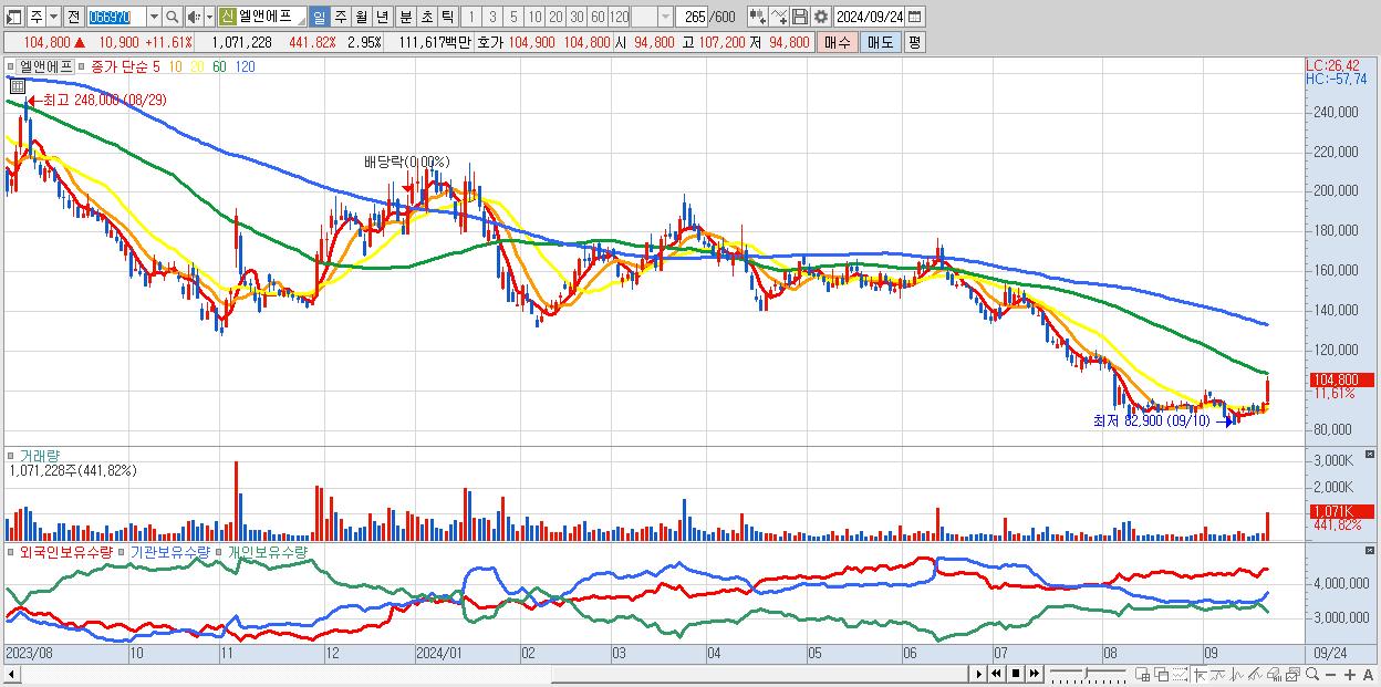 - 엘앤에프 (104,800원 ▲ 11.61% , 시총: 38,039억, 거래량: 1,071,228, 거래대금:1,116억)