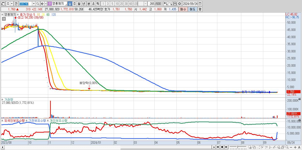 - 영풍제지 (1,760원 ▲ 22.14% , 시총: 818억, 거래량: 27,080,920, 거래대금:464억)