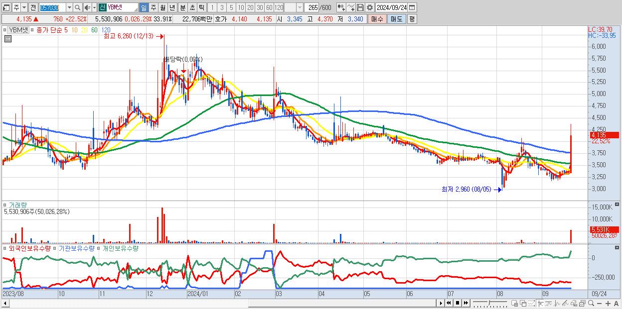 - YBM넷 (4,135원 ▲ 22.52% , 시총: 675억, 거래량: 5,530,906, 거래대금:227억)