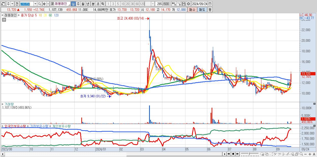 - 래몽래인 (13,720원 ▲ 12.74% , 시총: 1,371억, 거래량: 1,107,139, 거래대금:147억)