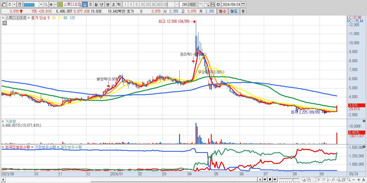 - 스튜디오미르 (3,070원 ▲ 29.81% , 시총: 1,004억, 거래량: 6,486,897, 거래대금:186억)