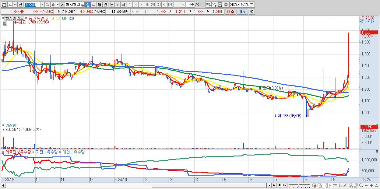 - 형지엘리트 (1,683원 ▲ 29.96% , 시총: 524억, 거래량: 9,205,267, 거래대금:145억)