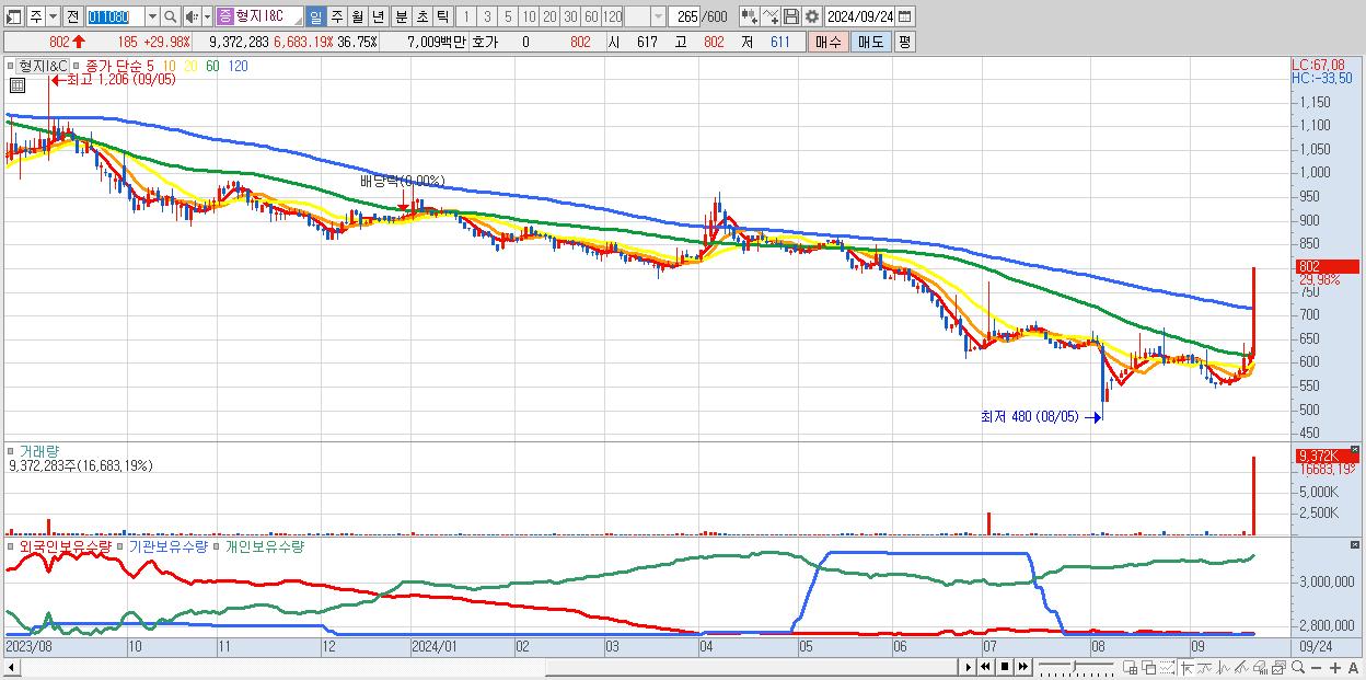 - 형지I&C (802원 ▲ 29.98% , 시총: 205억, 거래량: 9,372,283, 거래대금:70억)