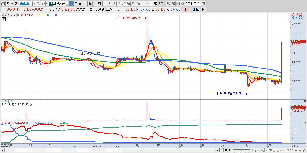 - 화천기공 (36,400원 ▲ 30% , 시총: 801억, 거래량: 610,131, 거래대금:212억)