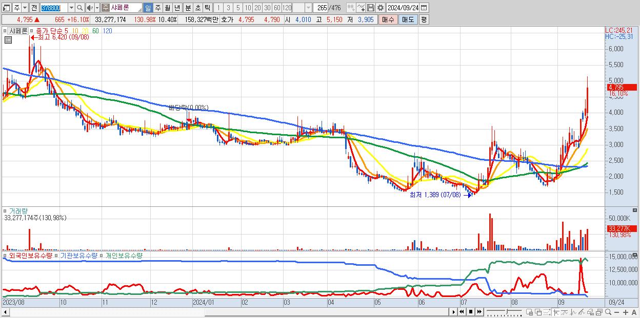 - 샤페론 (4,795원 ▲ 16.1% , 시총: 1,445억, 거래량: 33,277,174, 거래대금:1,583억)