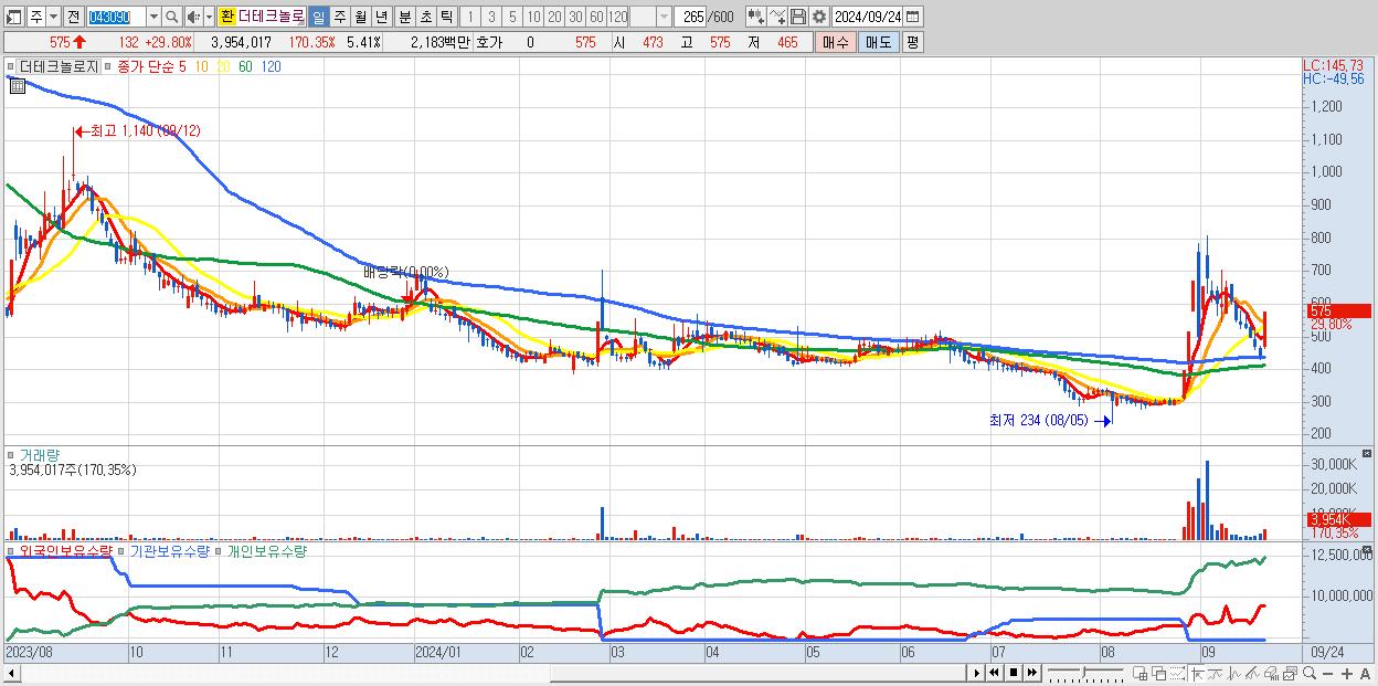 - 더테크놀로지 (575원 ▲ 29.8% , 시총: 421억, 거래량: 3,954,017, 거래대금:22억)