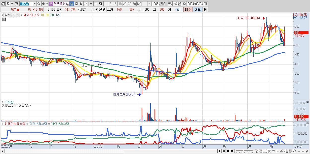 - 씨엔플러스 (567원 ▲ 13.4% , 시총: 385억, 거래량: 3,163,287, 거래대금:18억)