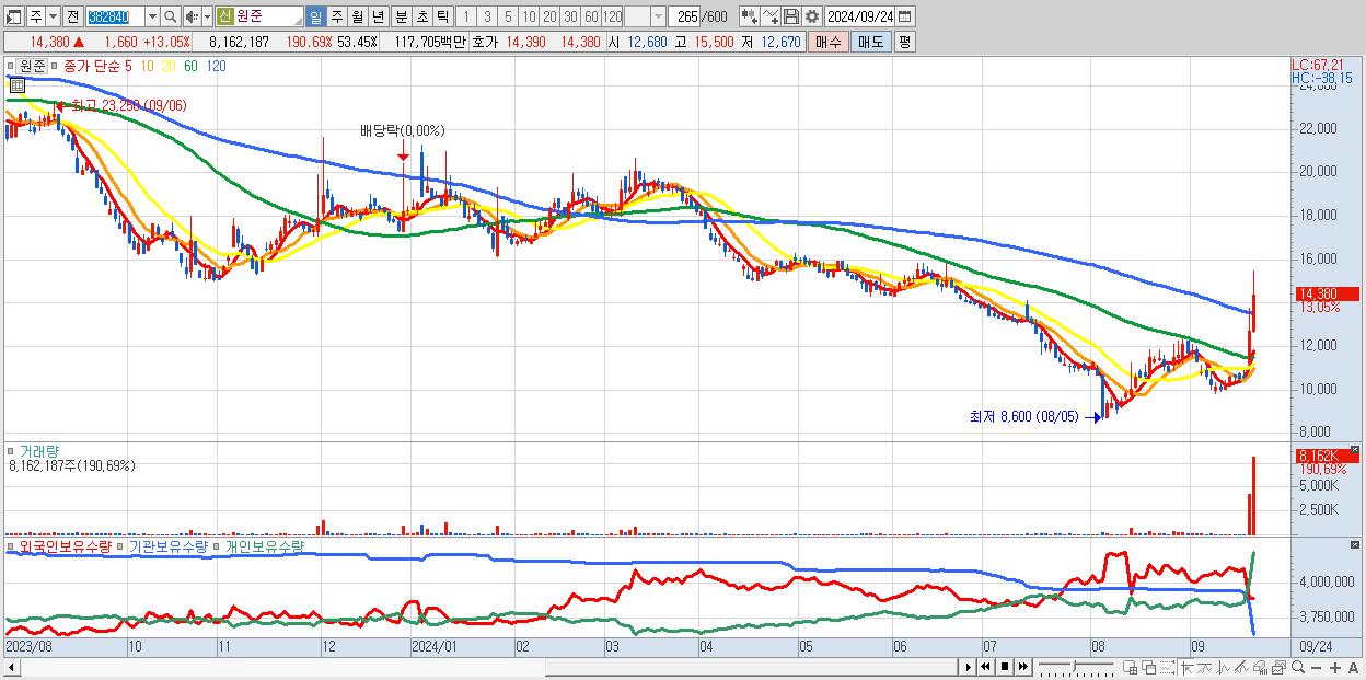 - 원준 (14,380원 ▲ 13.05% , 시총: 2,196억, 거래량: 8,162,187, 거래대금:1,177억)
