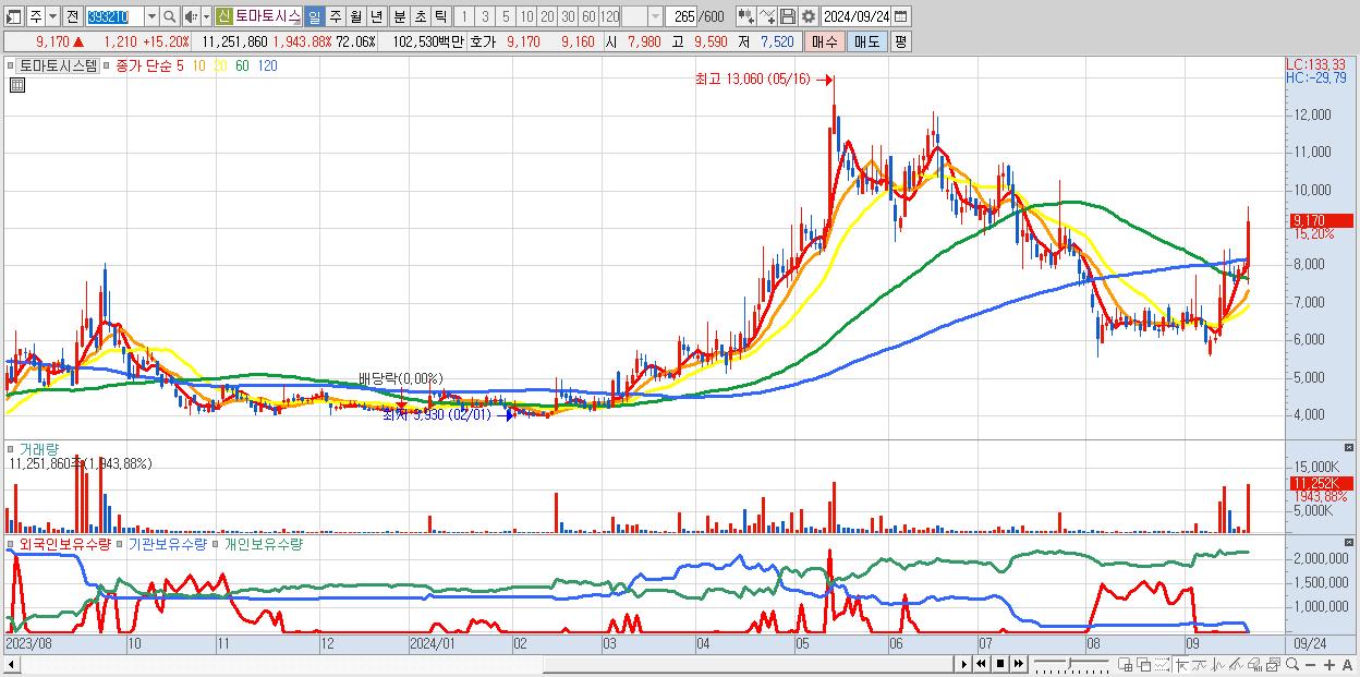 - 토마토시스템 (9,170원 ▲ 15.2% , 시총: 1,432억, 거래량: 11,251,860, 거래대금:1,025억)