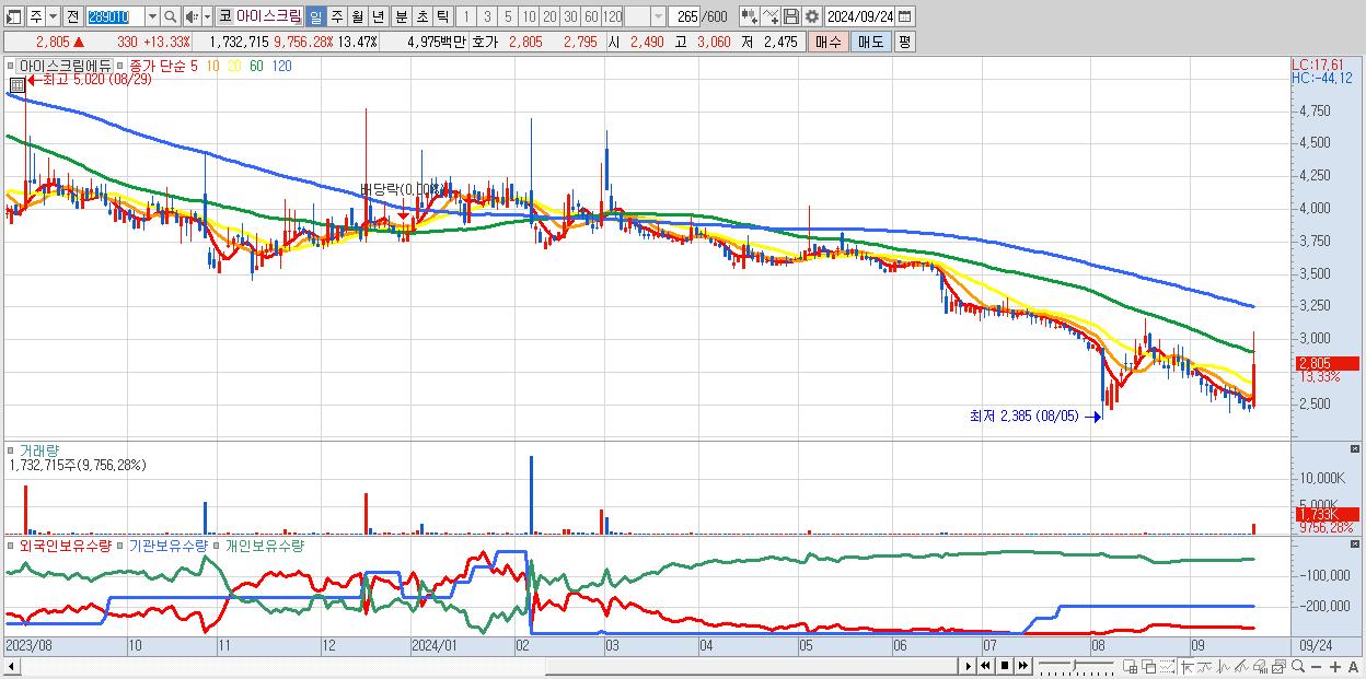 - 아이스크림에듀 (2,805원 ▲ 13.33% , 시총: 361억, 거래량: 1,732,715, 거래대금:50억)