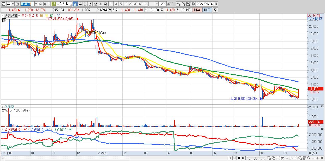 - 송원산업 (11,420원 ▲ 12.07% , 시총: 2,741억, 거래량: 245,104, 거래대금:27억)