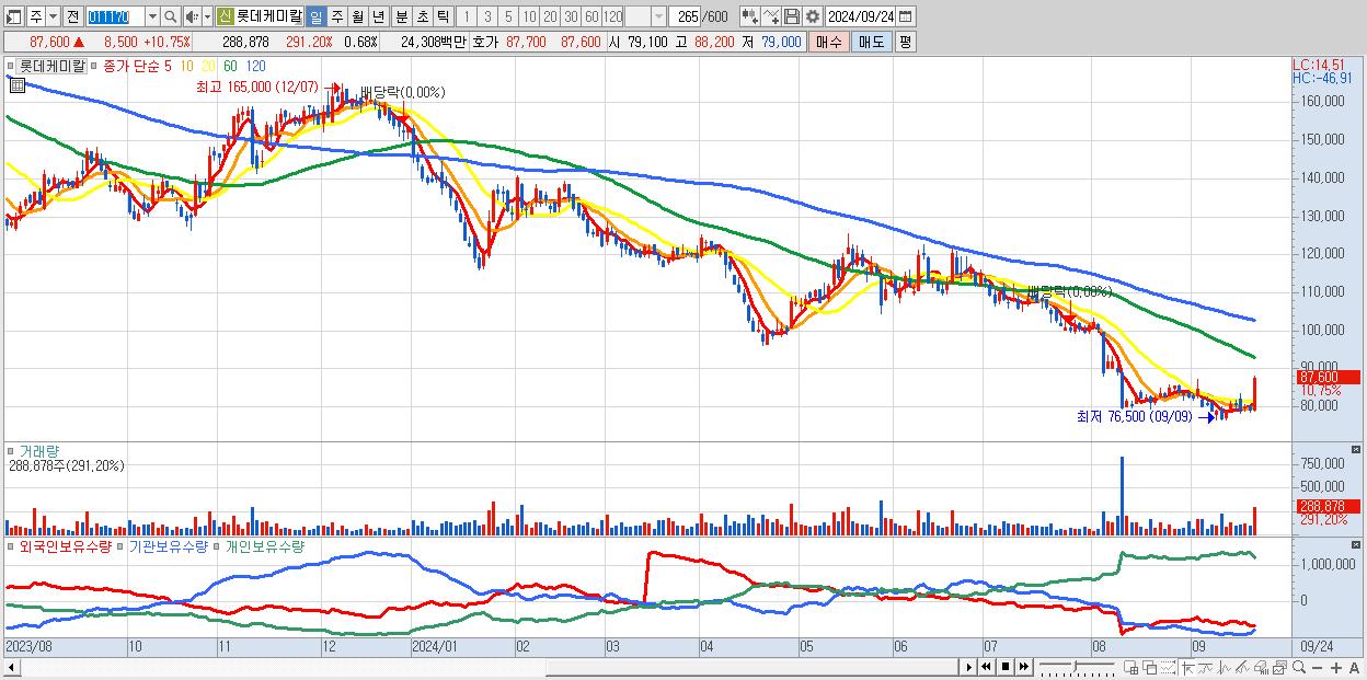 - 롯데케미칼 (87,600원 ▲ 10.75% , 시총: 37,471억, 거래량: 288,878, 거래대금:243억)