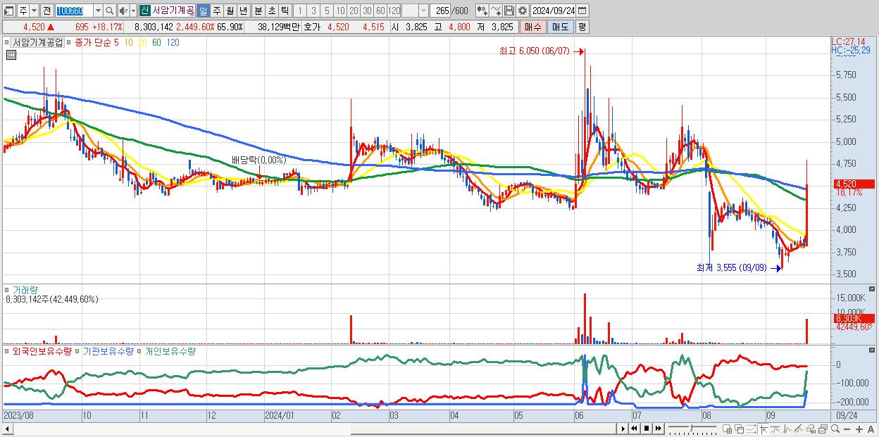 - 서암기계공업 (4,520원 ▲ 18.17% , 시총: 570억, 거래량: 8,303,142, 거래대금:381억)