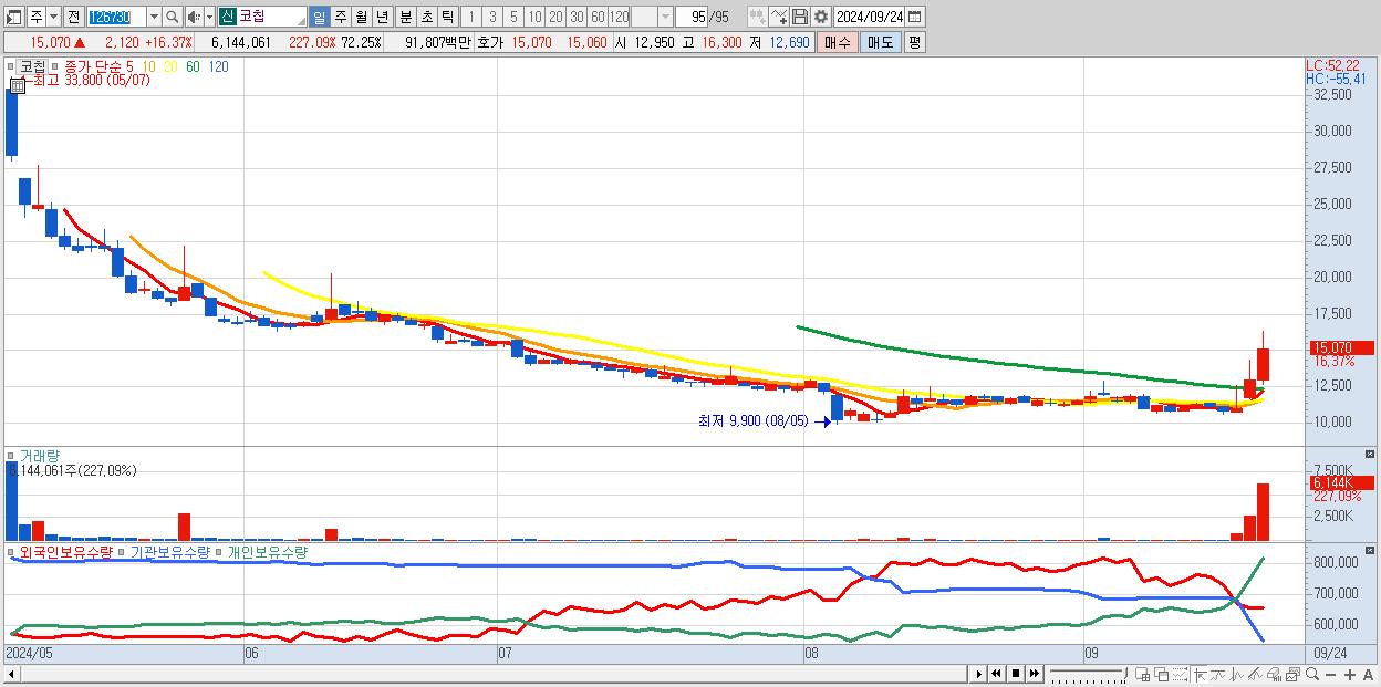 - 코칩 (15,070원 ▲ 16.37% , 시총: 1,281억, 거래량: 6,144,061, 거래대금:918억)