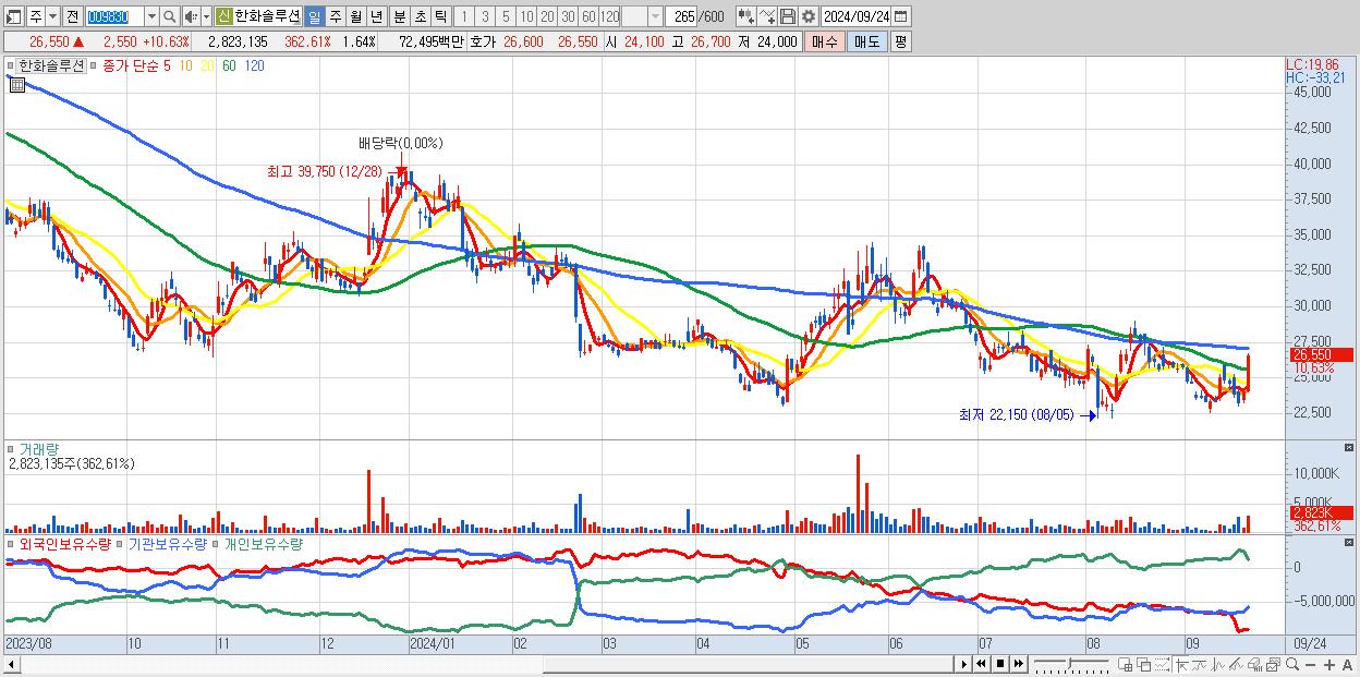 - 한화솔루션 (26,550원 ▲ 10.63% , 시총: 45,637억, 거래량: 2,823,135, 거래대금:725억)