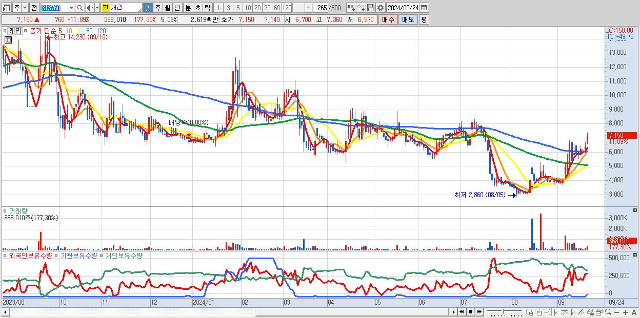 - 캐리 (7,150원 ▲ 11.89% , 시총: 521억, 거래량: 368,010, 거래대금:26억)