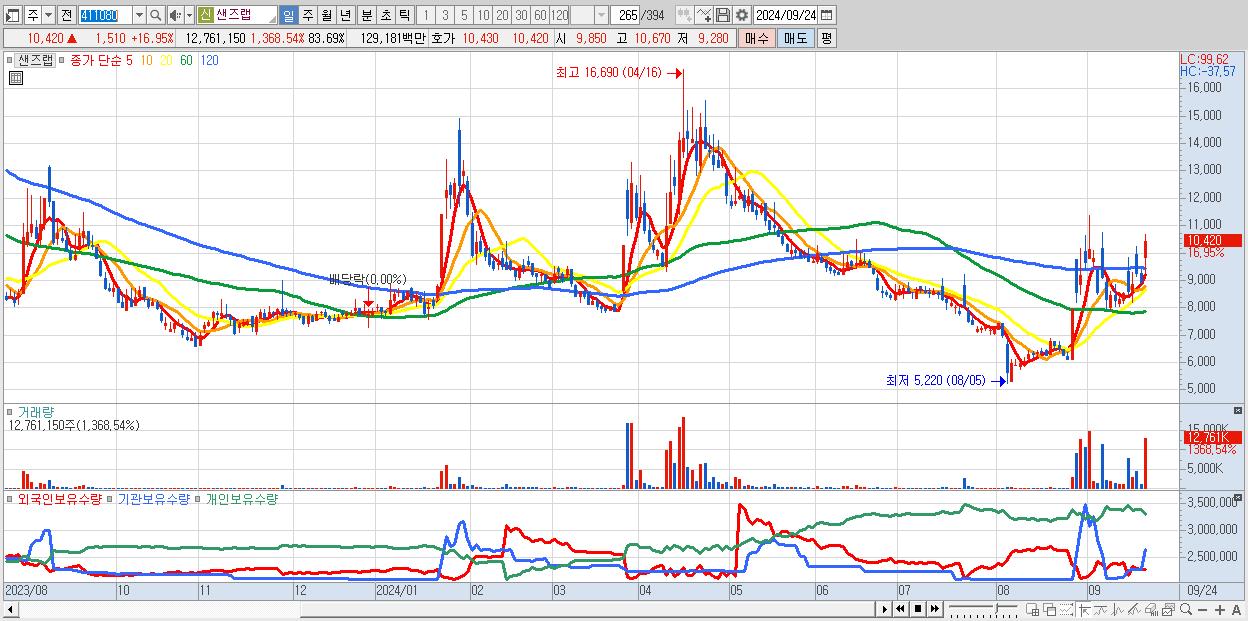 - 샌즈랩 (10,420원 ▲ 16.95% , 시총: 1,589억, 거래량: 12,761,150, 거래대금:1,292억)