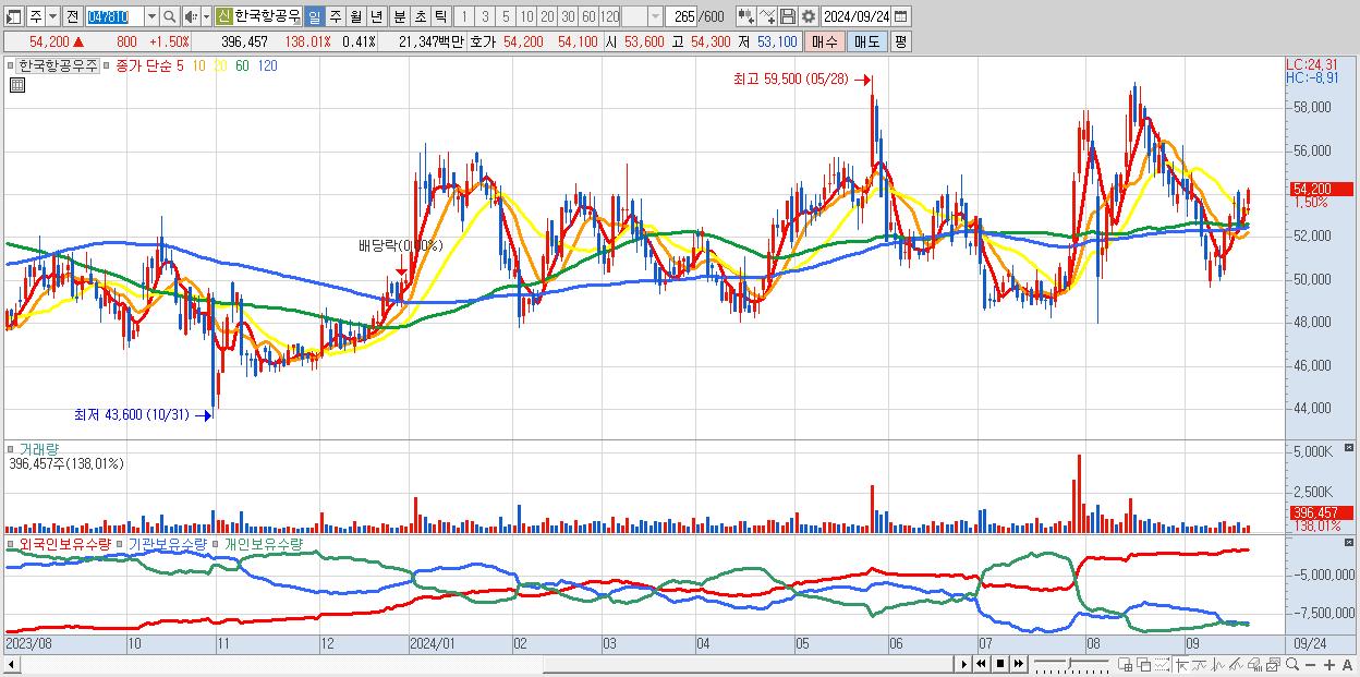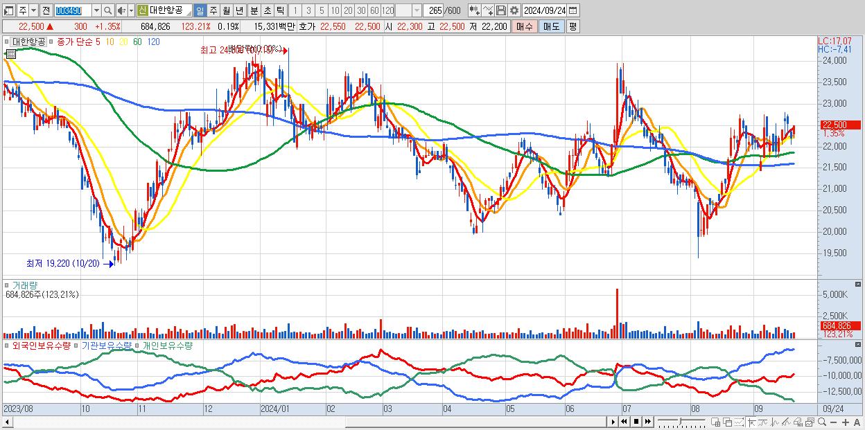 - 대한항공 (22,500원 ▲ 1.35% , 시총: 82,850억, 외국인 순매수 거래금:62억)