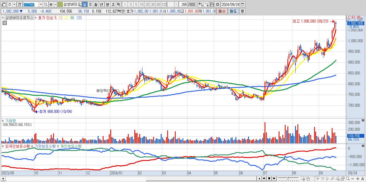 - 삼성바이오로직스 (1,082,000원 ▼ -0.46% , 시총: 770,103억, 외국인 순매수 거래금:203억)