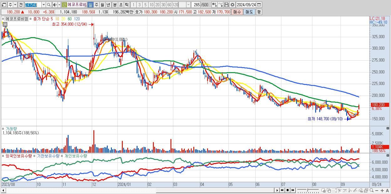 - 에코프로비엠 (180,200원 ▲ 6.38% , 시총: 176,238억, 외국인 순매수 거래금:233억)