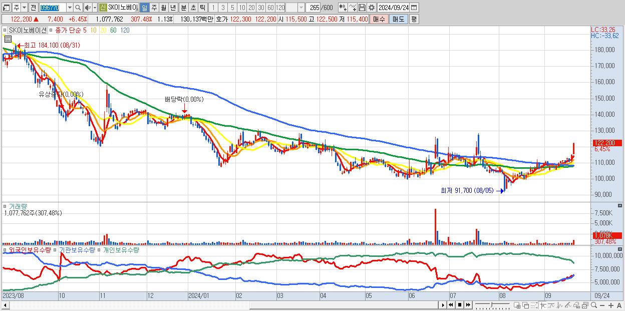 - SK이노베이션 (122,200원 ▲ 6.45% , 시총: 116,989억, 외국인 순매수 거래금:230억)
