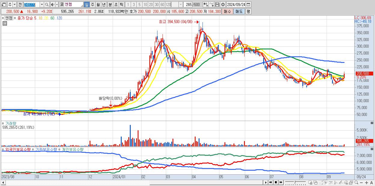 - 엔켐 (200,500원 ▲ 9.2% , 시총: 41,678억, 외국인 순매수 거래금:170억)