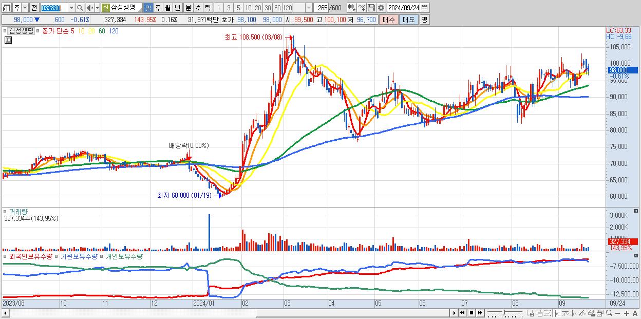 - 삼성생명 (98,000원 ▼ -0.61% , 시총: 196,000억, 외국인 순매수 거래금:148억)