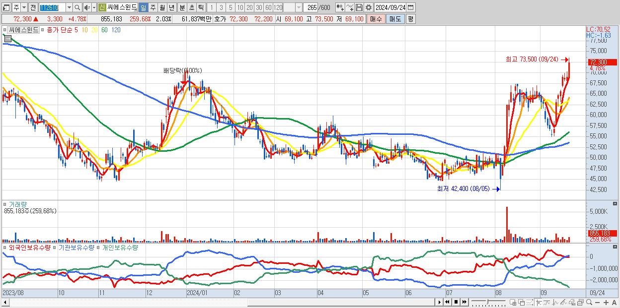 - 씨에스윈드 (72,300원 ▲ 4.78% , 시총: 30,490억, 외국인 순매수 거래금:99억)
