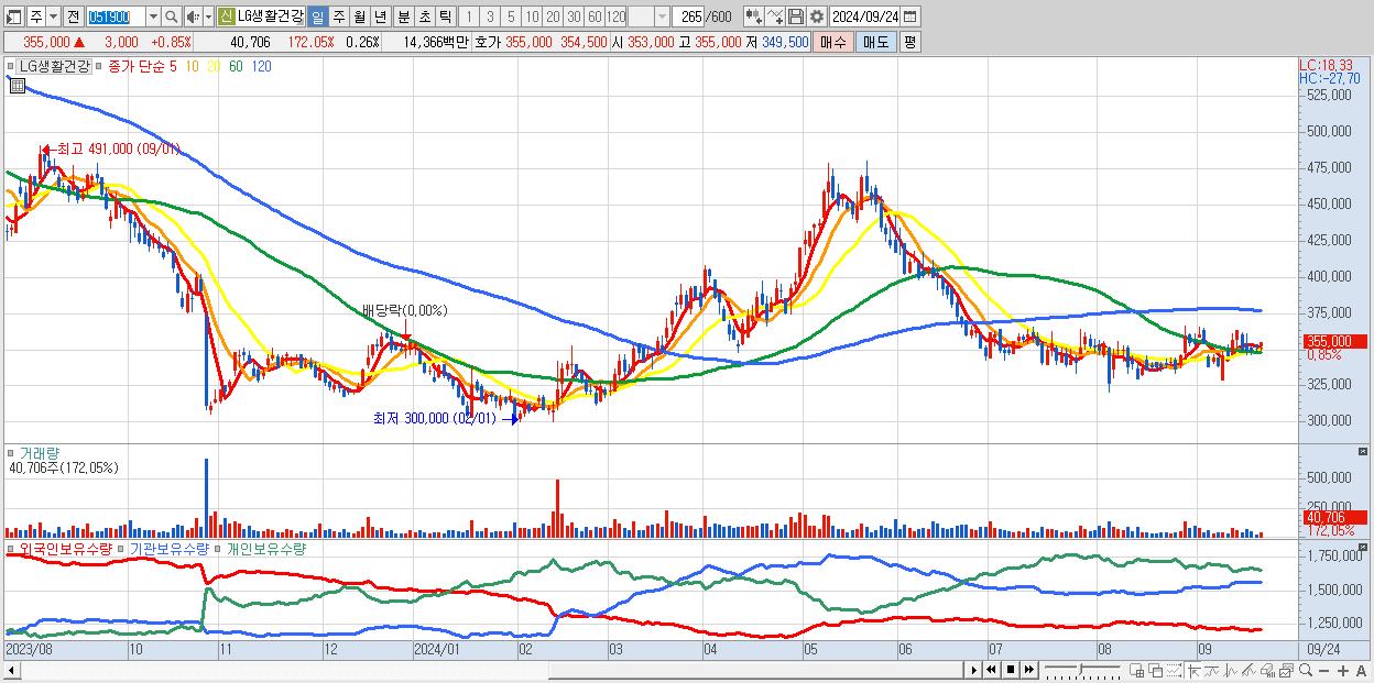 - LG생활건강 (355,000원 ▲ 0.85% , 시총: 55,445억, 외국인 순매수 거래금:52억)