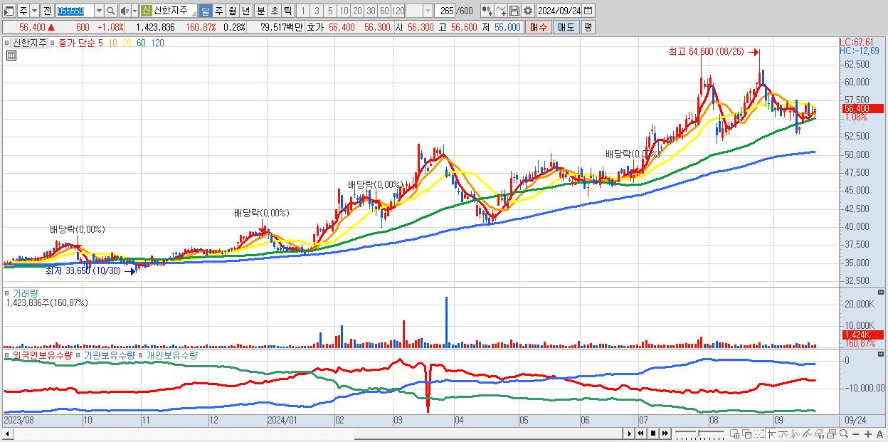- 신한지주 (56,400원 ▲ 1.08% , 시총: 287,298억, 외국인 순매수 거래금:81억)