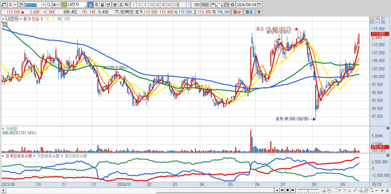 - LG전자 (113,500원 ▲ 2.34% , 시총: 185,740억, 외국인 순매수 거래금:131억)