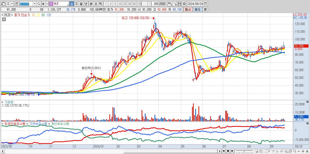 - HLB (91,200원 0% , 시총: 119,367억, 외국인 순매수 거래금:57억)