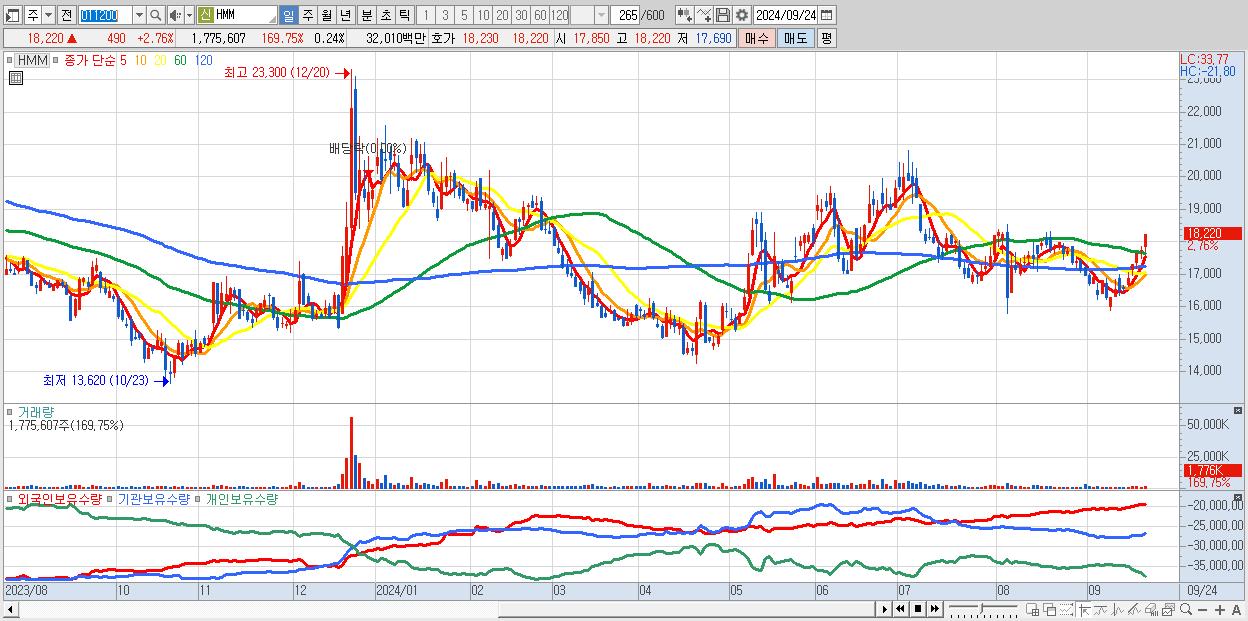 - HMM (18,220원 ▲ 2.76% , 시총: 136,475억, 외국인 순매수 거래금:136억)