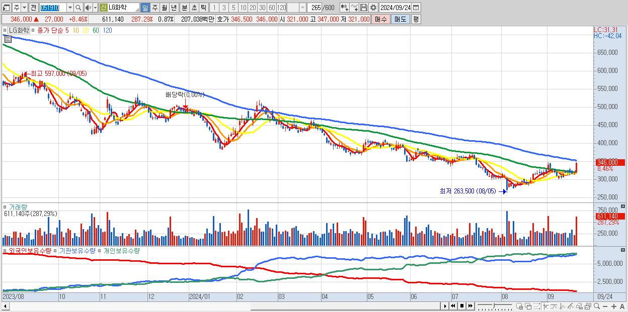 - LG화학 (346,000원 ▲ 8.46% , 시총: 244,250억, 외국인 순매수 거래금:229억)