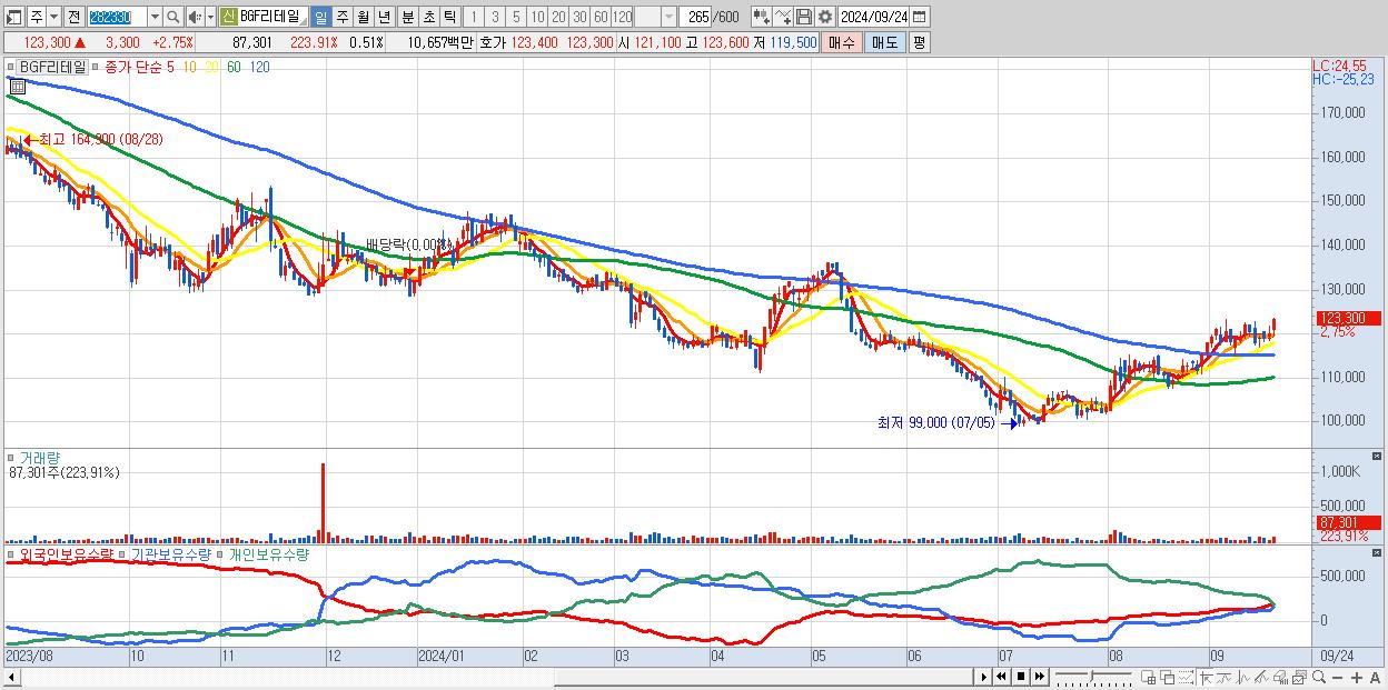 - BGF리테일 (123,300원 ▲ 2.75% , 시총: 21,311억, 외국인 순매수 거래금:51억)