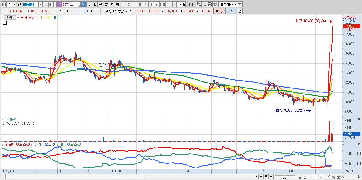 - 젬백스 (17,830원 ▲ 11.51% , 시총: 7,131억, 외국인 순매수 거래금:54억)