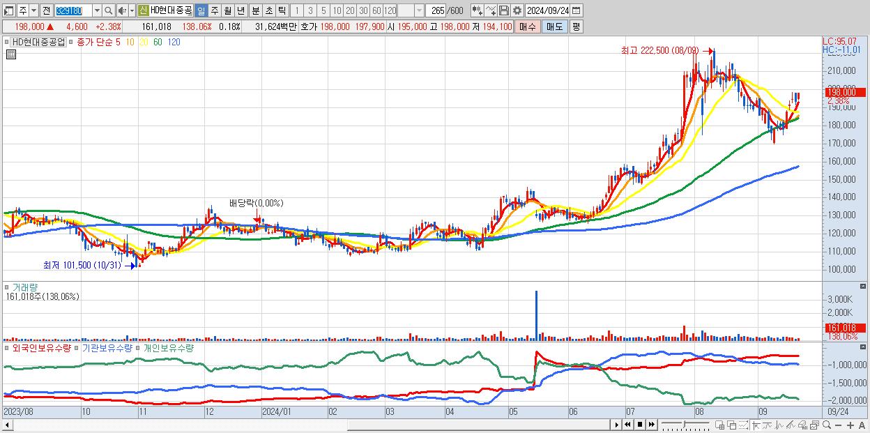 - HD현대중공업 (198,000원 ▲ 2.38% , 시총: 175,771억, 외국인 순매수 거래금:95억)
