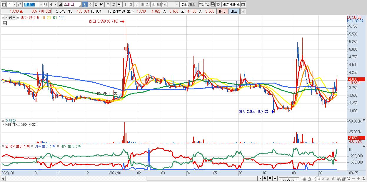- 스페코 (4,030원 ▲ 10.56% , 시총: 591억, 거래량: 2,649,713, 거래대금:103억)