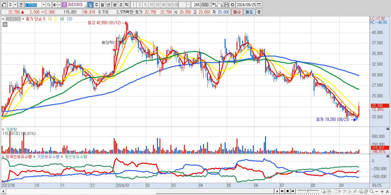 - 유티아이 (22,700원 ▲ 12.38% , 시총: 3,697억, 거래량: 115,831, 거래대금:26억)