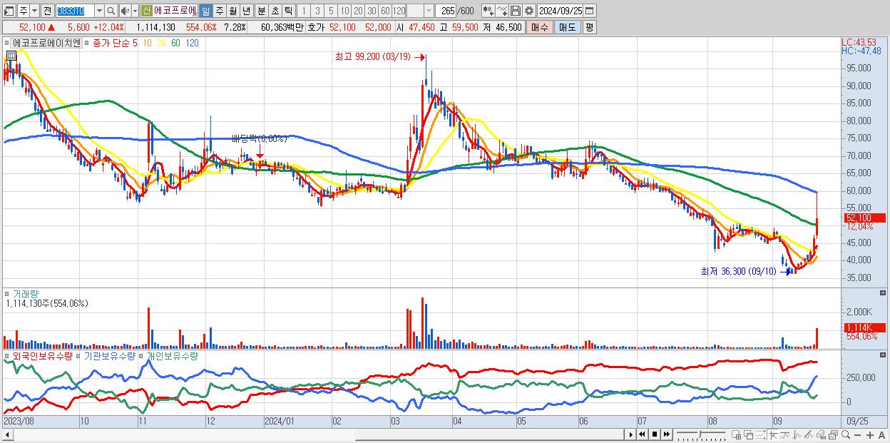 - 에코프로에이치엔 (52,100원 ▲ 12.04% , 시총: 7,974억, 거래량: 1,114,130, 거래대금:604억)