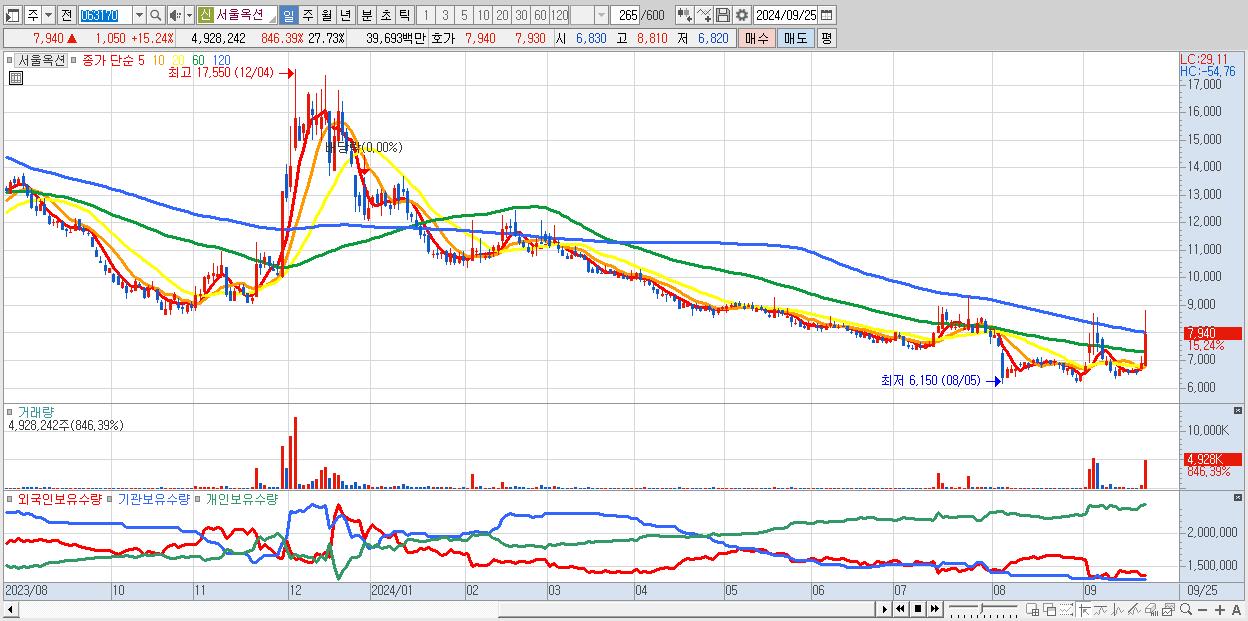 - 서울옥션 (7,940원 ▲ 15.24% , 시총: 1,411억, 거래량: 4,928,242, 거래대금:397억)