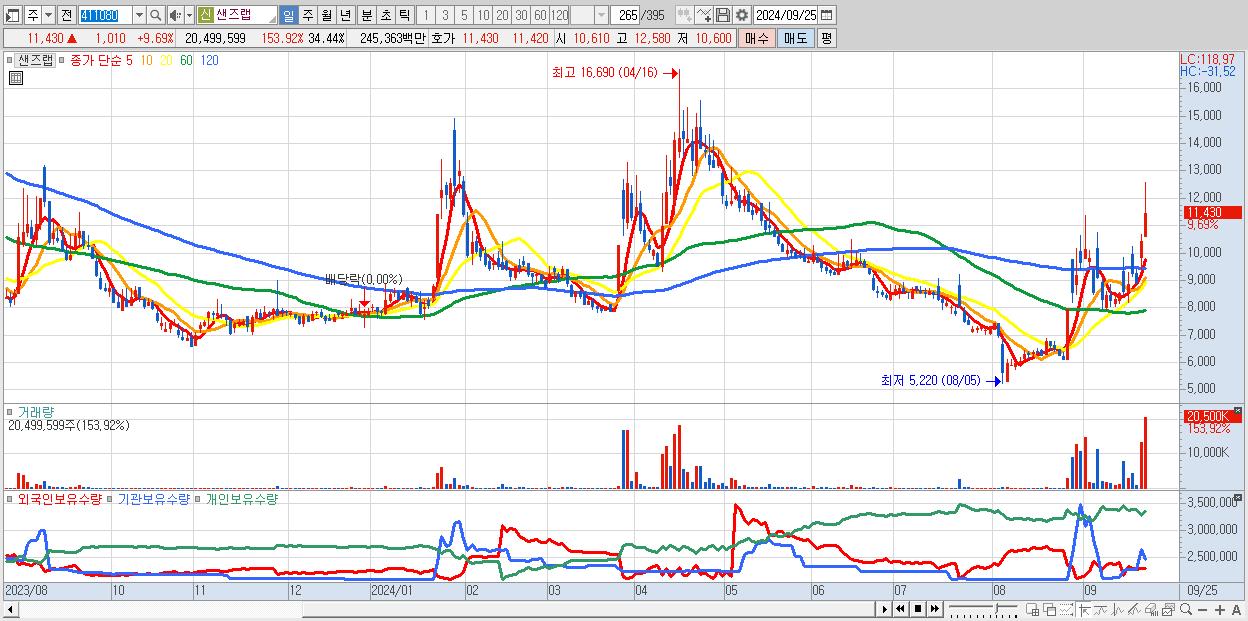 - 샌즈랩 (11,430원 ▲ 9.69% , 시총: 1,743억, 거래량: 20,499,599, 거래대금:2,454억)