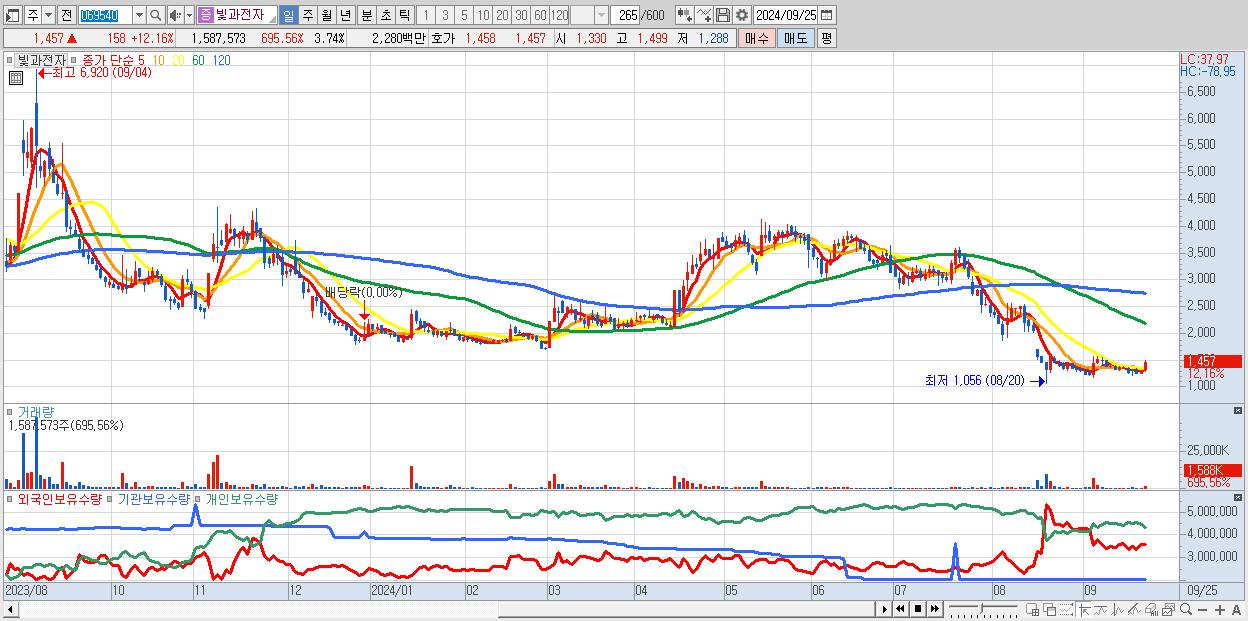 - 빛과전자 (1,457원 ▲ 12.16% , 시총: 618억, 거래량: 1,587,573, 거래대금:23억)