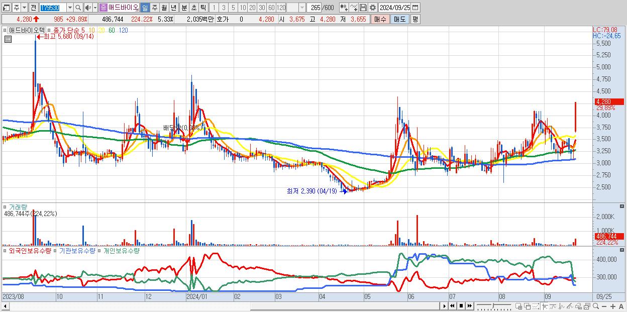 - 애드바이오텍 (4,280원 ▲ 29.89% , 시총: 391억, 거래량: 486,744, 거래대금:20억)
