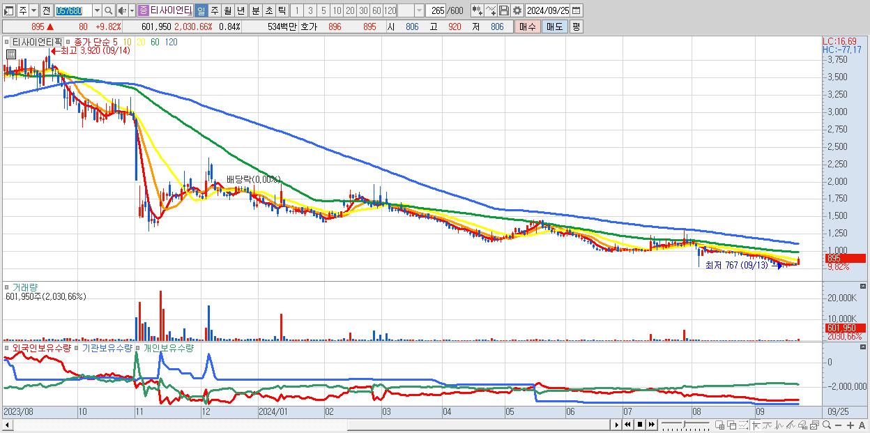 - 티사이언티픽 (895원 ▲ 9.82% , 시총: 638억, 거래량: 601,950, 거래대금:5억)