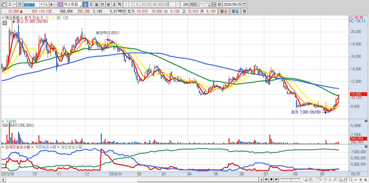 - 넥스트칩 (10,000원 ▲ 10.13% , 시총: 1,809억, 거래량: 568,854, 거래대금:55억)