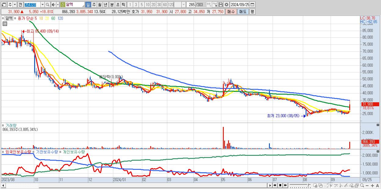 - 알멕 (31,900원 ▲ 18.81% , 시총: 2,039억, 거래량: 866,393, 거래대금:281억)