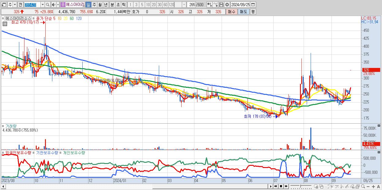 - 에스아이리소스 (326원 ▲ 29.88% , 시총: 233억, 거래량: 4,436,780, 거래대금:14억)
