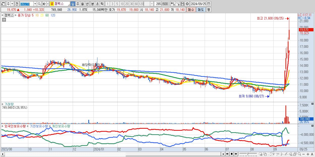 - 젬백스 (19,670원 ▲ 10.32% , 시총: 7,867억, 거래량: 749,848, 거래대금:150억)