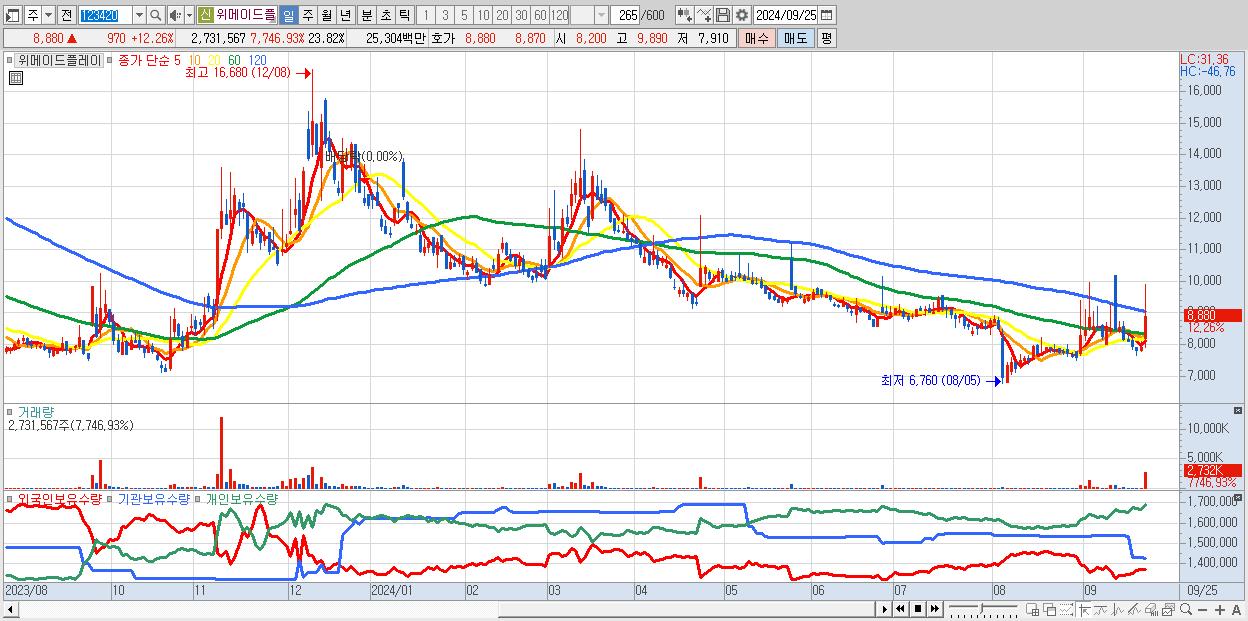 - 위메이드플레이 (8,880원 ▲ 12.26% , 시총: 1,019억, 거래량: 2,731,567, 거래대금:253억)